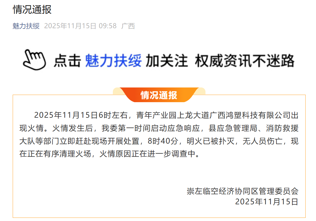 2025年11月15日6时左右,青年产业园上龙大路广西鸿塑科技有限公司呈现火情。火情发生后,我委第一时间痛不欲生应急呼应,县应急管理局、消防救援大队等部分当即赶赴现场展开处置,8时40分,明火已被熄灭,无人员受伤或逝世,现在正在有序整理火场,火情原因正在进一步查询中。