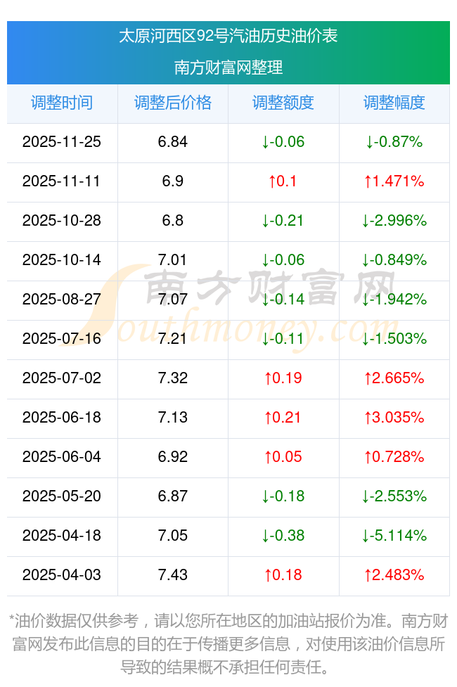 油价调整一手音讯 :本轮油价调整时刻为11月25日 : 全国92号汽油平均价格为:7元每升,其间,最低为陕西,价格6.78元/升,最高为海南,价格8.00元/升。 全国95号汽油平均价格为:7元每升,其间,最低为陕西,价格7.16元/升,最高为海南,价格8.49元/升。 全